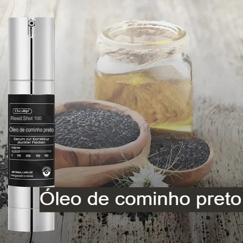 Com óleo natural de cominho preto – rico em timoquinona e antioxidantes. Alivia manchas escuras, cicatrizes de acne e hiperpigmentação.