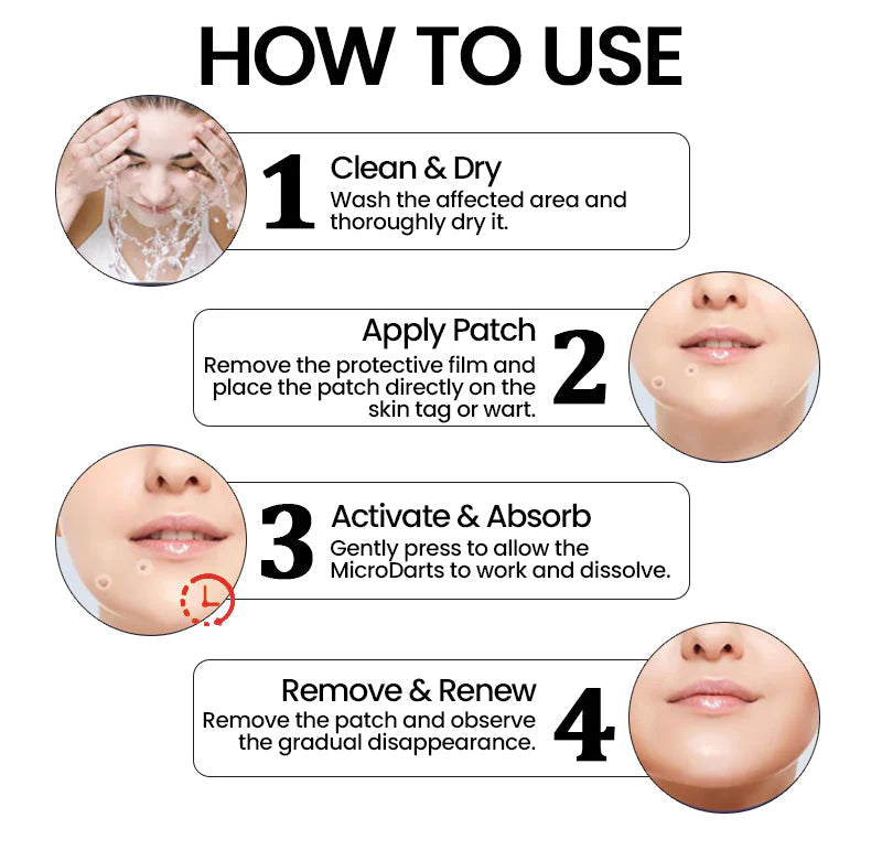 Ao contrário de cremes ou kits de congelamento, o TAG'Gone Patch atua na origem da marca de pele: 1️⃣ MicroDarts penetram na marca -MicroDarts de dissolução minúscula fornecem ingredientes ativos profundamente na marca de pele 2️⃣ Quebra gradual -A fórmula rompe a estrutura da marca, fazendo com que ela encolha e seque naturalmente 3️⃣ Sem dor, sem cicatrizes -Em 7 a 14 dias, a marca cai, deixando para trás uma pele lisa e limpa