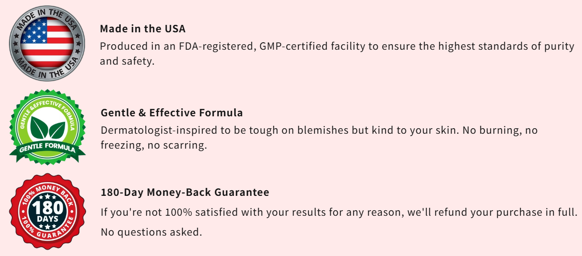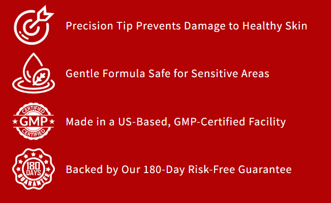 R: Não queimamos, congelamos ou corroemos. Nossa solução foi desenvolvida em um laboratório profissional com certificação GMP e funciona sinalizando suave e naturalmente para que a mancha seque e desapareça, enquanto nutre a pele subjacente para garantir uma cicatrização suave e limpa.